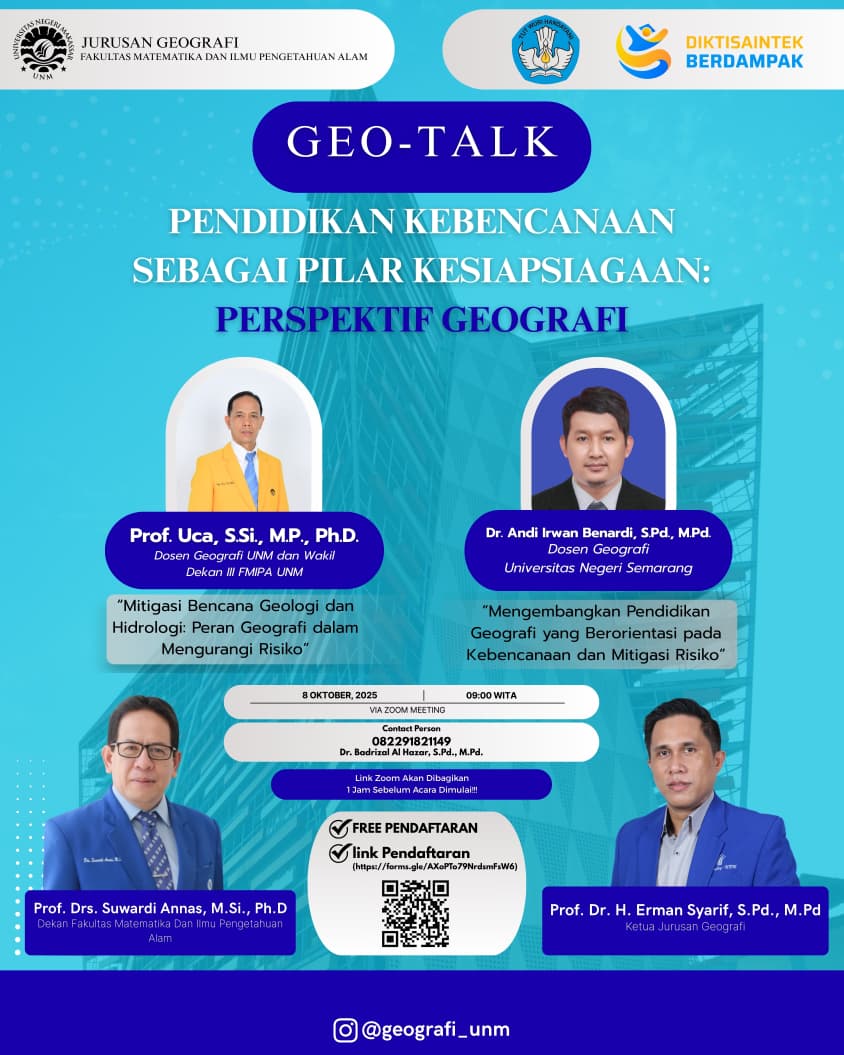 Jurusan Geografi FMIPA UNM Sukses Selenggarakan Webinar GEO-TALK: Pendidikan Kebencanaan sebagai Pilar Kesiapsiagaan